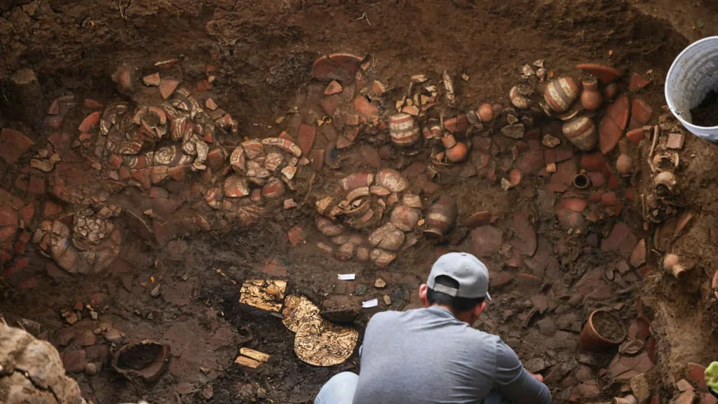 Los restos óseos están rodeados de objetos de oro y vasijas de cerámica decoradas con imágenes tradicionales, lo que indica que correspondería a personas de «alto estatus», dijo la arqueóloga Julia Mayo, quien detalló que la tumba fue construida «entre los años 800 y 1000 después de Cristo».